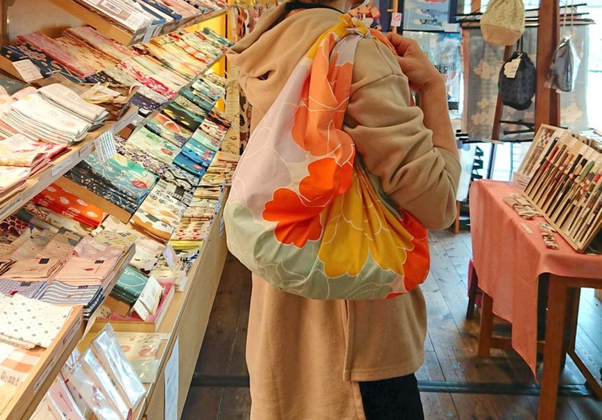 バッグ型に結んで、ショルダーバッグに、キャリーケースの上にサブバックとして、またスカーフのように身にまとってもご利用いただけます。